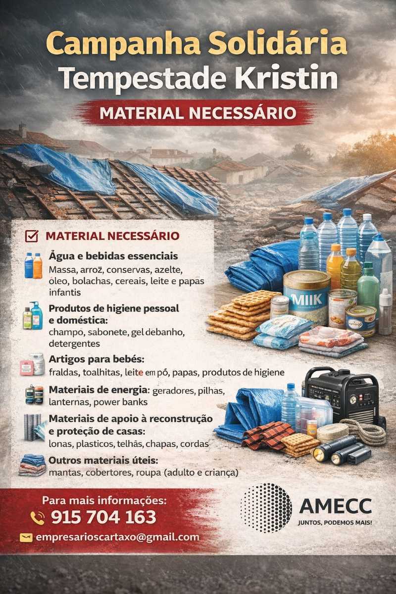 A AMECC – Associação Movimento dos Empresários do Concelho do Cartaxo está a organizar uma ação de recolha de bens essenciais para apoiar as populações mais afetadas pela tempestade Kristin, que causou danos significativos em várias regiões do país.